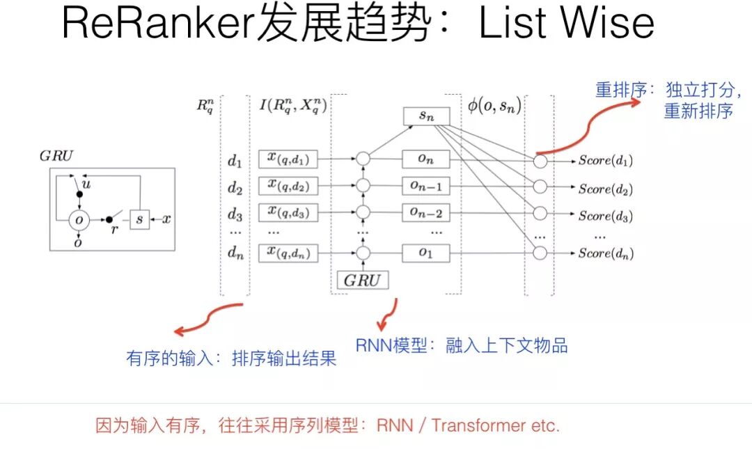 从模型结构上来看。因为重排序模块往往是放在精排模块之后,而精排已经对推荐物品做了比较准确的打分,所以往往重排模块的输入是精排模块的 Top 得分输出结果,也就是说,是有序的。而精排模块的打分或者排序对于重排模块来说,是非常重要的参考信息。于是,这个排序模块的输出顺序就比较重要,而能够考虑到输入的序列性的模型,自然就是重排模型的首选。我们知道,最常见的考虑时序性的模型是 RNN 和 Transformer,所以经常把这两类模型用在重排模块,这是很自然的事情。一般的做法是:排序 Top 结果的物品有序,作为 RNN 或者 Transformer 的输入,RNN 或者 Transformer 明显可以考虑在特征级别,融合当前物品上下文,也就是排序列表中其它物品,的特征,来从列表整体评估效果。RNN 或者 Transformer 每个输入对应位置经过特征融合,再次输出预测得分,按照新预测的得分重新对物品排序,就完成了融合上下文信息,进行重新排序的目的。