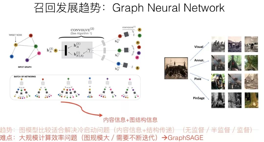 我们可以进一步思考下,图节点因为可以带有属性信息,比如物品的 Content 信息,所以明显这对于解决物品侧的冷启动问题有帮助;而因为它也允许知识在图中远距离进行传递,所以比如对于用户行为比较少的场景,可以形成知识传递和补充,这说明它也比较适合用于数据稀疏的推荐场景;另外一面,图中的边往往是通过用户行为构建的,而用户行为,在统计层面来看,本质上是一种协同信息,比如我们常说的 "A 物品协同 B 物品",本质上就是说很多用户行为了物品 A 后,大概率会去对物品 B 进行行为;所以图具备的一个很好的优势是:它比较便于把协同信息、用户行为信息、内容属性信息等各种异质信息在一个统一的框架里进行融合,并统一表征为 embedding 的形式,这是它独有的一个优势,做起来比较自然。另外的一个特有优势,就是信息在图中的传播性,所以对于推荐的冷启动以及数据稀疏场景应该特别有用。