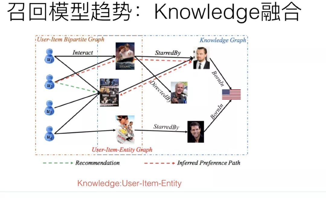 这种知识拓展,可能比较适合用在召回阶段,因为对于传统观点的召回来说,精准并不是最重要的目标,找出和用户兴趣有一定程度相关性但是又具备泛化性能的物品是召回侧的重点,所以可能知识图谱的模式更适合将知识图谱放在召回侧。