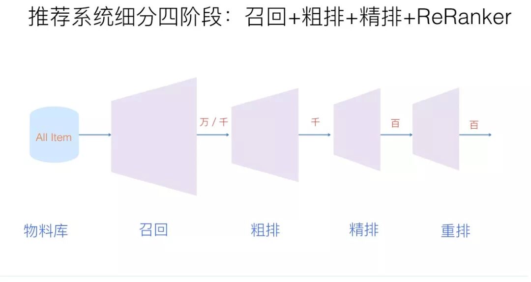 四个环节分别是:召回、粗排、精排和重排。召回目的如上所述;有时候因为每个用户召回环节返回的物品数量还是太多,怕排序环节速度跟不上,所以可以在召回和精排之间加入一个粗排环节,通过少量用户和物品特征,简单模型,来对召回的结果进行个粗略的排序,在保证一定精准的前提下,进一步减少往后传送的物品数量,粗排往往是可选的,可用可不同,跟场景有关。之后,是精排环节,使用你能想到的任何特征,可以上你能承受速度极限的复杂模型,尽量精准地对物品进行个性化排序。排序完成后,传给重排环节,传统地看,这里往往会上各种技术及业务策略,比如去已读、去重、打散、多样性保证、固定类型物品插入等等,主要是技术产品策略主导或者为了改进用户体验的。