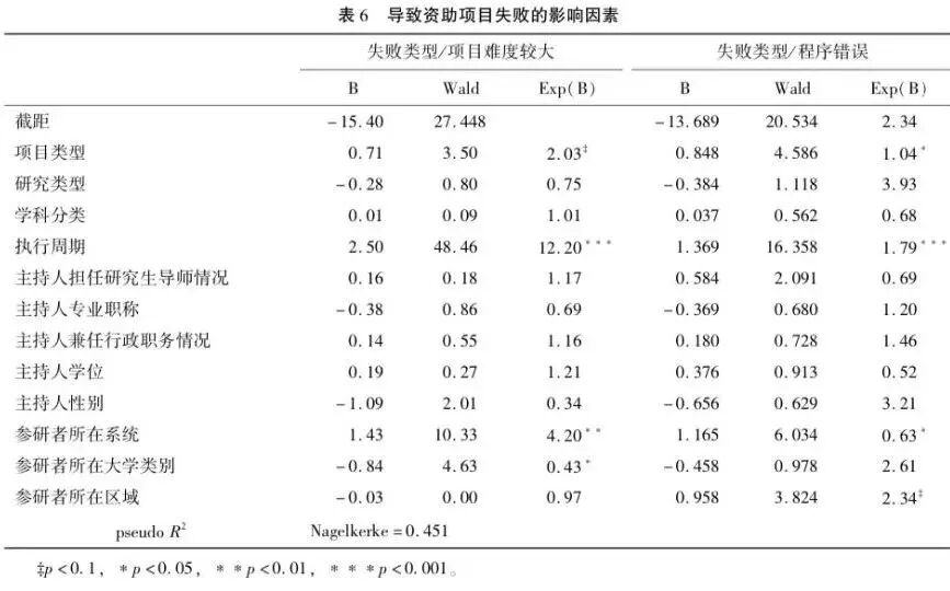 为检验造成项目失败的主要因素,把12个因子作为控制变量做多元逻辑回归分析。伪 R2=.451。一般来说,该值大于.3就表明该模型的拟合优度较好,故而该模型设置合理,可靠性有保障。依回归分析结果中各自变量回归系数估值大小,我们将影响因素由大到小分为4组:(1)第一组变量的影响最显著,包括项目周期这一个变量(p<0.001)。即项目执行周期对项目资助成败的影响最大。该结论有两种可能的解释路径:一是项目执行周期越长则项目面临的不可控因素越多,如项目成员变化、项目主持人的研究旨趣发生转移等都会导致项目失败;二是一些项目主持人存在“重申请轻执行”问题,项目立项后并未实际投入研究,采取“拖延”策略。(2)第二组因子影响非常显著,包括参研者系统和大学类别这两个变量,对项目资助失败风险有较大影响。承担项目的系统不同,失败风险存在显著差异(p<0.05或p<0.01)。与其他系统相比,高校系统承担的项目的失败风险更大。在高校系统内,不同类型大学承担项目的失败风险的差异显著(p<0.05),985类大学比其他大学有更高的失败风险。造成这一结果的原因可能是高校系统的项目主持人身兼教学和科研双重职责、时间紧缺,985类重点大学教师承担科研项目的机会更多,科研压力更大,因而他们失败的风险更高。(3)第三组因子影响较为显著,包括项目类型和项目接受者所在的省区市,对项目资助成败也有一定影响。不同项目类型的失败风险存在一定差异(p<0.05或p<0.1),一般项目比其他项目有更高的失败风险。可能的原因在于,国家社科一般项目的承担者大多已有高级职称,其科研探索的动力在衰减。项目承担者所在的省区市不同,其失败风险也存在一定差异(p<0.1),东部地区研究者承担的项目比中部和西部地区的研究者承担的项目有更高的失败风险。可能的解释是,东部发达地区学者的生活成本高(尤其是特大城市房价较高),学者迫于生活压力而承担了更多的科研任务,导致科研失败风险增加;中西部地区学者的生活成本较低,项目主持人能够以更加从容的心态从事科研创新工作,因而提高了科研项目的成功率。社科基金项目风险存在区域差异,这是本研得出的一个新发现,但其背后是否还有更深层次的经济社会原因,有待深入研究。(4)第四组因子的影响不显著,包括研究类型、学科种类等其余7个变量(p>0.1),对项目资助成败的影响不明显。![]()