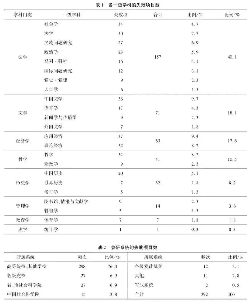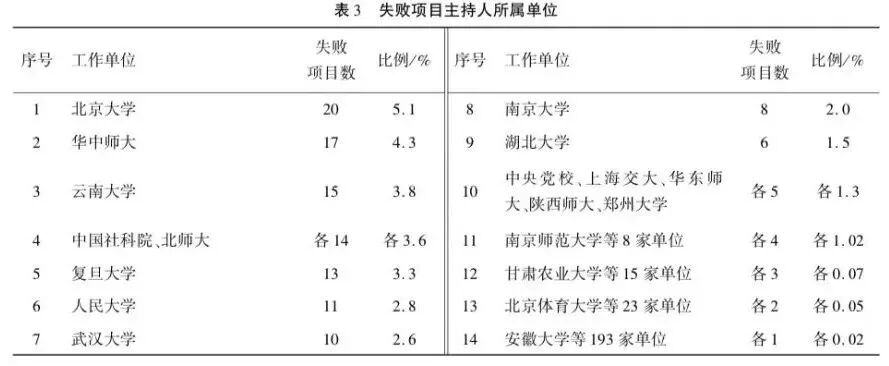 在所有失败项目中,一般项目占比最高(241项,占总数的61.5%),其次为青年项目(78项,占19.9%),西部项目为58项(占14.8%),重点项目为14项(3.6%),后期资助项目仅1项(不到1%)。统计表明,在392个失败课题中,基础研究188项,占总数的48%;其次是应用研究,有124项,占31.6%;综合研究和其他研究分别为50项和30项,分别占12.8%和7.7%。基础研究具有创新周期长、不确定性高等特点,是人文社科研究的难点,出现失败项目是科学研究中要付出的试错成本或探索代价,应予以宽容。表1表明,参与统计的23个一级学科均有失败项目,失败项目最少的为统计学(仅1项),最多的为中国文学(38项)。在社科基金项目覆盖的“大学科”中(申报数量较多、立项指标较多的学科),中国文学、应用经济、理论经济、哲学、社会学、法学等6个一级学科中的失败项目数均超过30项。在社科基金项目覆盖的“小学科”(申报数量较少、立项指标较少的学科)中,宗教学(9项)、人口学(6项)、考古学(5项)和统计学(1项)等3个一级学科领域资助失败的占比较小,其资助的失败项目数均少于9项。总体而言,社科基金资助失败社科基金项目的学科差异非常显著。文史哲是哲学社会科学的基础学科,但其资助失败项目数均较大(中国文学、哲学和中国历史三个学科资助失败项目数之和高达90个,占失败项目总数的22.9%),这表明,基础学科领域课题研究通常难度大、风险高;理论经济与应用经济两个一级学科的资助失败项目达69个,占失败项目总数的17.6%,经济学科是每年立项数最多的学科,表明国家以经济建设为中心的战略在社科基金立项方面得到的充分重视,但研究者在积极回应经济发展中热点难点议题的同时,也应注重项目研究的质量水准。总体而言,高校系统失败项目数占了失败项目总数的76.0%,高校的项目失败数比其他6个系统失败项目数之和的3倍还多。一方面是由于高校获得的立项课题基数大,但也从侧面反映出高等学校社科基金项目失败的风险较大,高校社科基金项目存在“重立项、轻结项”的问题,应该进一步加强高校社科基金项目的结项监管。此外,中国社科院是历届社科基金的立项大户,但其失败项目数较少,表明其社科基金项目的质量较高。社科基金项目失败数量与其所在单位的科研管理政策取向有一定关系,是一个单位科研管理水平的重要表征。总体而言,失败项目主要集中于立项数较多且人文社科研究实力较强的高等院校,但各单位的数量分布有一定差异。![]()