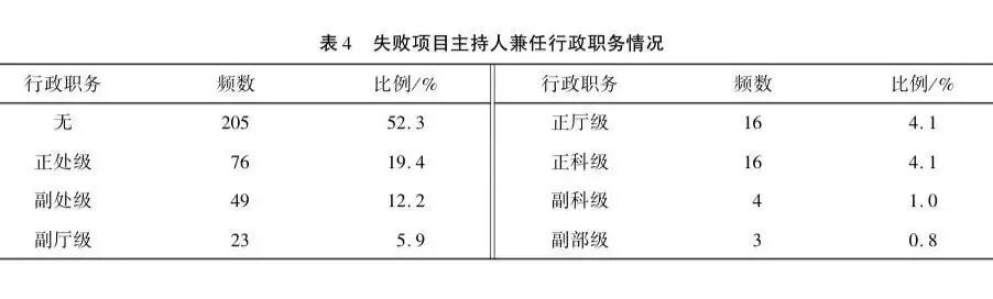 项目主持人是社科基金课题的第一责任人,是影响项目成败的主要因素。本研究对失败项目主持人的性别、学位、担任导师、专业职务以及兼任行政职务情况做了统计,试图描述失败项目主持人的基本面貌。考虑到国家社科基金立项中男性占优势,故而不能确定男性是否有更高的失败风险。在学位方面,社科基金项目的失败风险与主持人的学历并无显著关联。项目主持人担任研究生导师是组建学术团队的重要依托,是其学术实力的重要标志。统计表明,未担任研究生导师的项目主持人,因缺乏研究助手或研究团队,其社科基金项目有更大的失败风险。但是,主持人为硕士生导师和博士生导师的也分别有17.9%和36.5%的失败项目,可能是由于部分研究生导师投入课题研究的时间和精力不足,仅靠研究生进行科研攻关不仅无法保障研究质量,而且容易出现学术不端现象。在392个失败项目的主持人中,有正高级职称者为203位,占总数的51.8%;有副高级职称者143位,占36.5%;中级职称者43位,占11.0%。有正高级职称的主持人有更多的项目失败风险,副高或中级职称主持人的项目失败风险反而较低,这可能与当前国内科研工作者的职称晋升体制有关:正高职称主持已经没有更多的职称晋升压力,社科基金项目的成败对其并无显著的压力,而副高和中级职称的主持人则面临职称晋升压力,因而更重视项目质量,减少了失败的风险。项目主持人兼任行政职务历来饱受非议,表4显示,失败项目主持人兼任行政领导职务者所占比例并不高,但考虑到行政领导作为主持人的立项数并不高,其失败项目数却较多,由此推断,项目主持人兼任行政领导,学术研究和行政工作存在一定冲突,难以保障社科基金项目的研究时间,故而其失败的风险较高。![]()