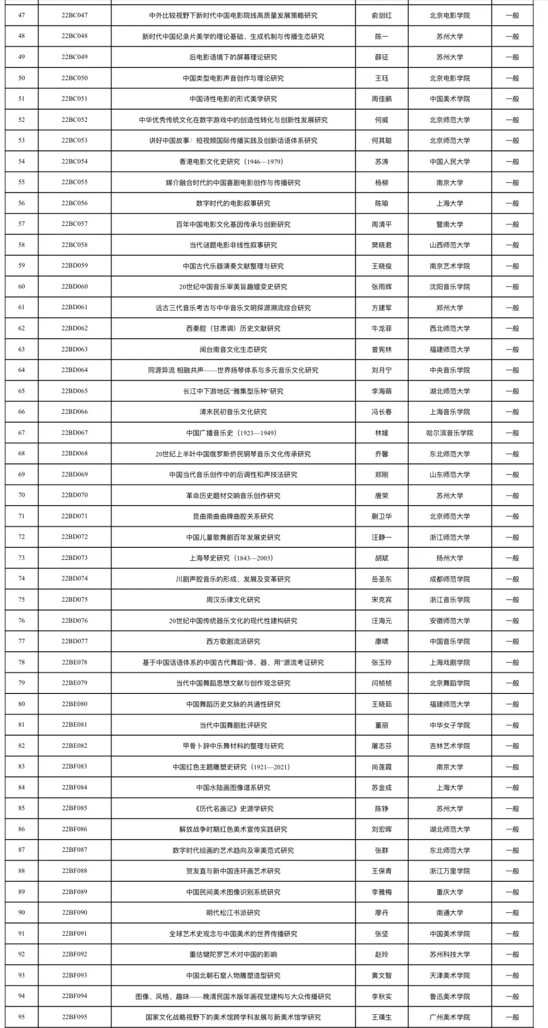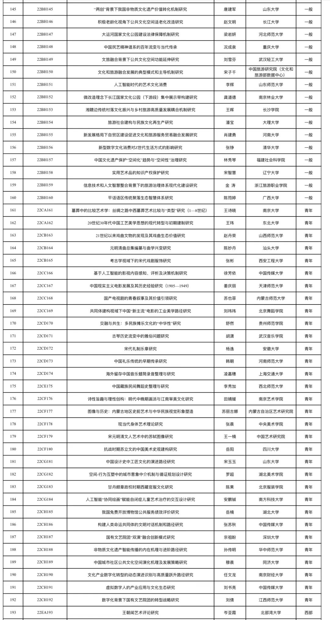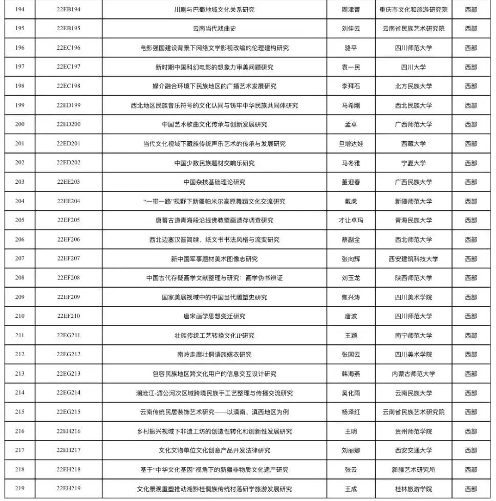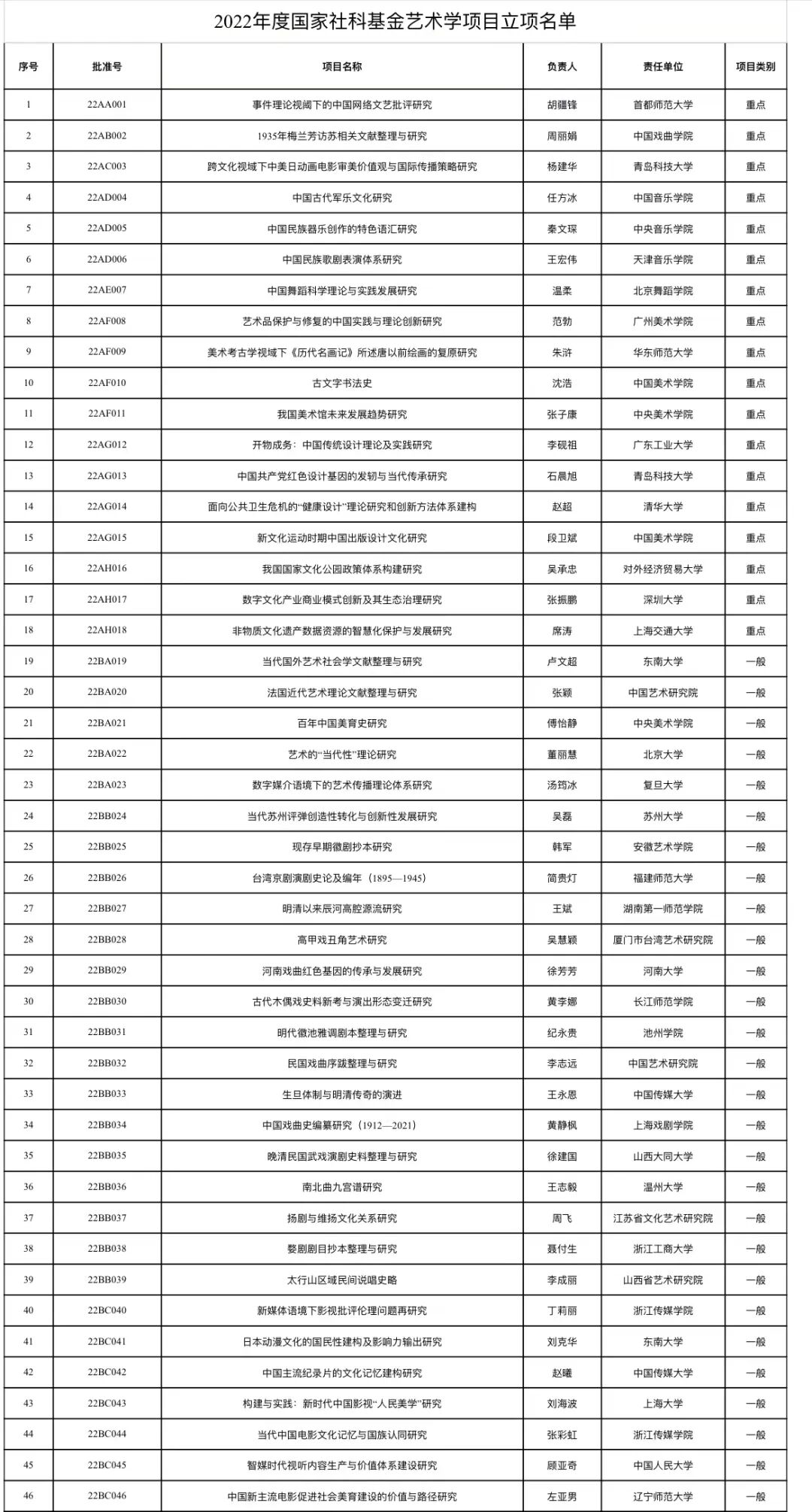 2022年度国家社科基金艺术学项目已完成受理申报、通讯初评、会议评审、网上公示等程序,经全国艺术科学规划领导小组批准,现将立项名单予以公布。 本年度共立项219项,其中重点项目18项,每项资助金额为35万元;一般项目142项,青年项目32项,西部项目27项,每项资助金额均为20万元。 ![]()