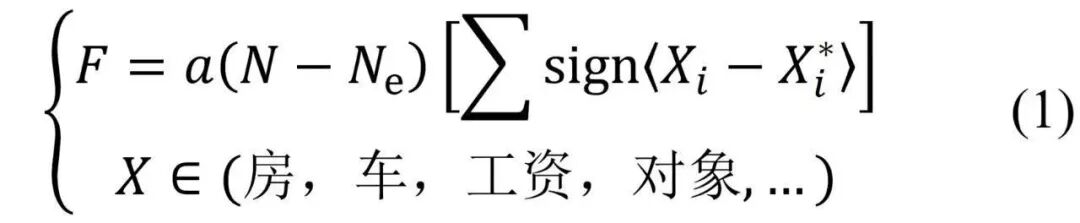 其中,F即为单身狗返乡过年期间遭受的瞬时压力,N为大龄青年的年龄,Ne为大龄青年结束中学教育的年龄(一般指高考年龄),a为学历因子(a>1, 且学历越高,该因子取值越大),Xi表示集合X中第i项元素的数目,Xi*为该项数目在周围同龄人中的平均值,sign为方向函数,定义如下: