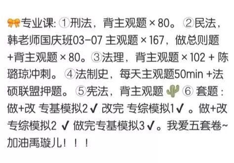 1.学习时间:9月18号之前只停留在单词阶段。雷区,时间太少了,血的教训,简直冒险,容易万劫不复。司考结束到考研,开始死磕英语。每天早上晨读半小时+背单词。每天1.30-4.50,英语时间,因为英语下午考试,然后你考试的时候就会长个英语脑子。