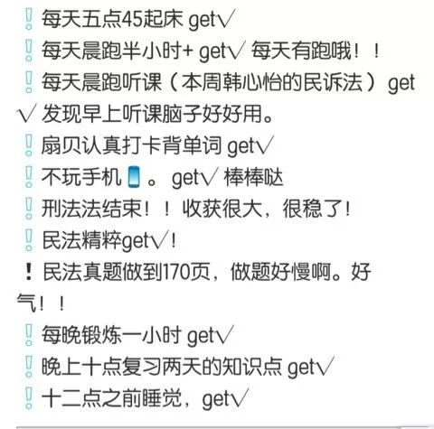 2.坚持运动。每天五公里左右的晨练,晚上还会去跳一个小时的舞,不要心疼运动的时间,运动完的一个小时可以顶两个小时的效率,跑出去,把自己找回来。享受流汗的过程,是最好的护肤品。而且!跑步的时候听课啊,下载一个变速音频播放器,听专业课的音频啊,1.7倍速跑起来特别带感,我会随身带一个小本子,听到重点,停下来,记在小本上,继续跑。就这样跑跑停停,嘴里跟着老师念念有词,一路上各种惊异的眼神,就差被送去强制医疗,坚持别人坚持不了的坚持,才能成就别人无法成就的成就啊。