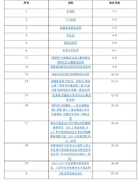 保研是一个持久战,需要前三年稳固保持GPA的同时,按部就班地多看书(这个我做的特别不好)、学英语、参加比赛、跟老师做项目等其他方法来充实提高自己。在这里讲的主要是大三下最后的冲刺阶段。保研的途径主要有三种:大三下一些法学院举办的夏令营、九月教育部推免系统开放前的预报名和九月推免系统开放后的直接在系统报名。前两种是法学院学生保研进入心仪院校的主要方式,但也不乏武大、中山、同济等高校法学院在系统开放后仍会根据学生申请情况筛选通知参加复试。一般各大高校法学院的夏令营在5月就会陆续发布举办夏令营的通知,但大家最好不要等到公布后再开始准备材料。因为刚开学大家相对清闲,进入5月后实际学习工作任务加重,心理压力也会变得很大。有心人其实也可以寒假准备,但我寒假回家计划好的学雅思、写大创结项材料,只完成了后者,雅思备考书籍从合肥背回呼伦贝尔一眼都没看(羞愧……)。在整理个人材料时建议大家最好在获奖证明前做一个目录(图1),方便老师查阅,发邮件时稍微注意下邮件礼仪(不过这些当然都不是最重要的,我当时是抱着硬件不够,软件做到位不让自己留遗憾的想法做的,如果硬件足够优秀也可以忽略)。