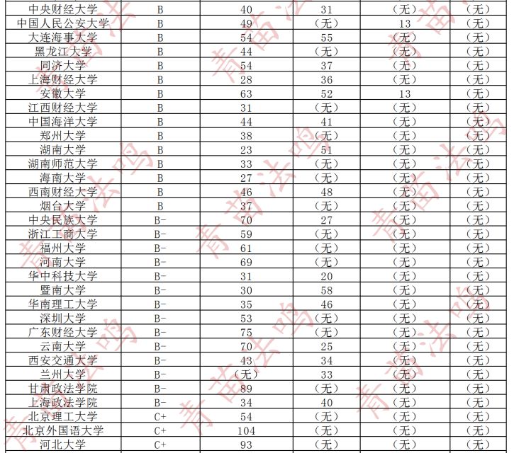 最后值得一提的是,对外经贸大学、苏州大学于国内各榜均在Top 30内。北京航空航天大学和重庆大学同属于教育部学科评估B+序列,于其余各榜也都在40左右,是近10年来理工科高校中法学学科发展比较快的典型。天津师范大学除在教育部第四轮学科评估外的其余三榜排名均在58以前,华中师范大学于软科、武书连榜上也排在58以前,或下一轮学科评估有望达到B-级以上。