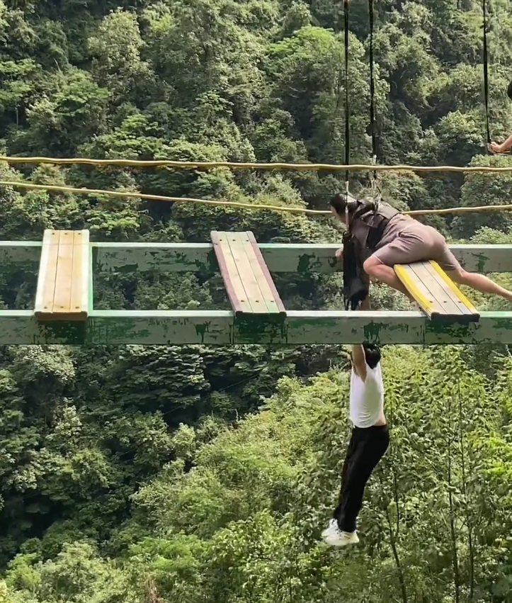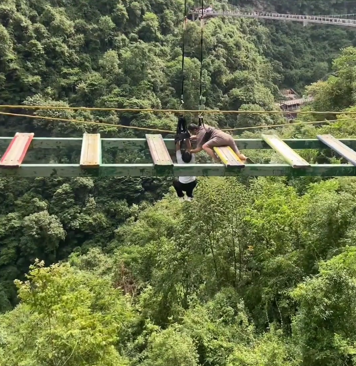 见其身体一动不动,有人在旁尝试救援,安全绳起初被拉起,在其将要被拉至桥上时,突然从空中坠落。据该景区介绍,“步步惊心”桥位于空中,“走在桥上仿佛漫步云端,能够将大地的美景尽收眼底”。
