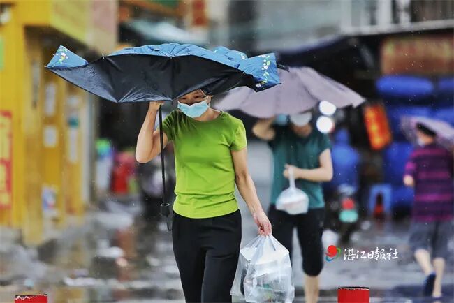 7月2日下午,湛江中心人民医院路段,市民在风雨中艰难前行。记者 张锋锋摄