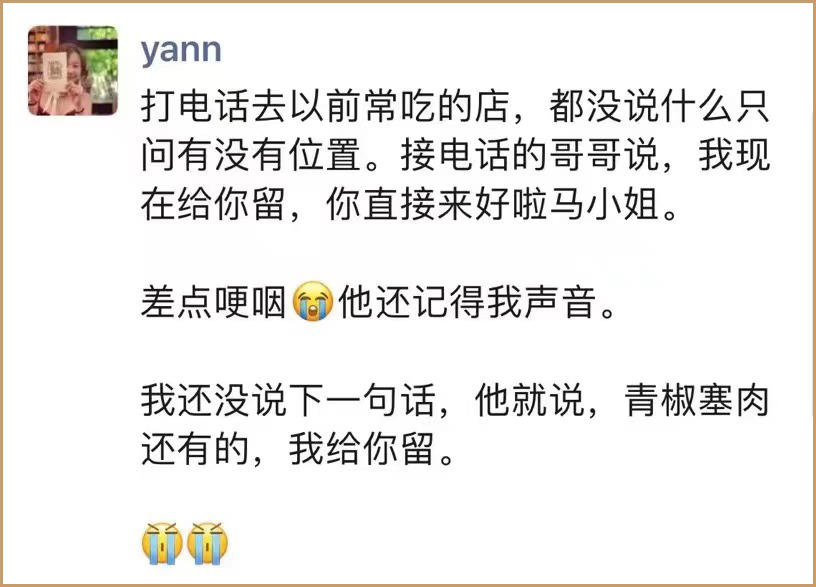 我没点进去看,只是这句话突然让我想起了前阵子一个朋友 @yann 发的朋友圈。当时正值上海解封,刚刚恢复堂食。