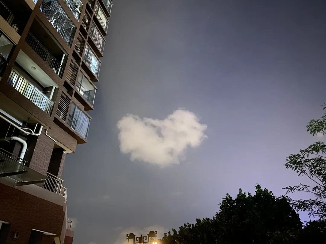 但当我走到家楼下时,抬头看了一眼,发现周围整片空旷的夜空中,只有一朵爱心型的云,感觉被天空表白了呢。
