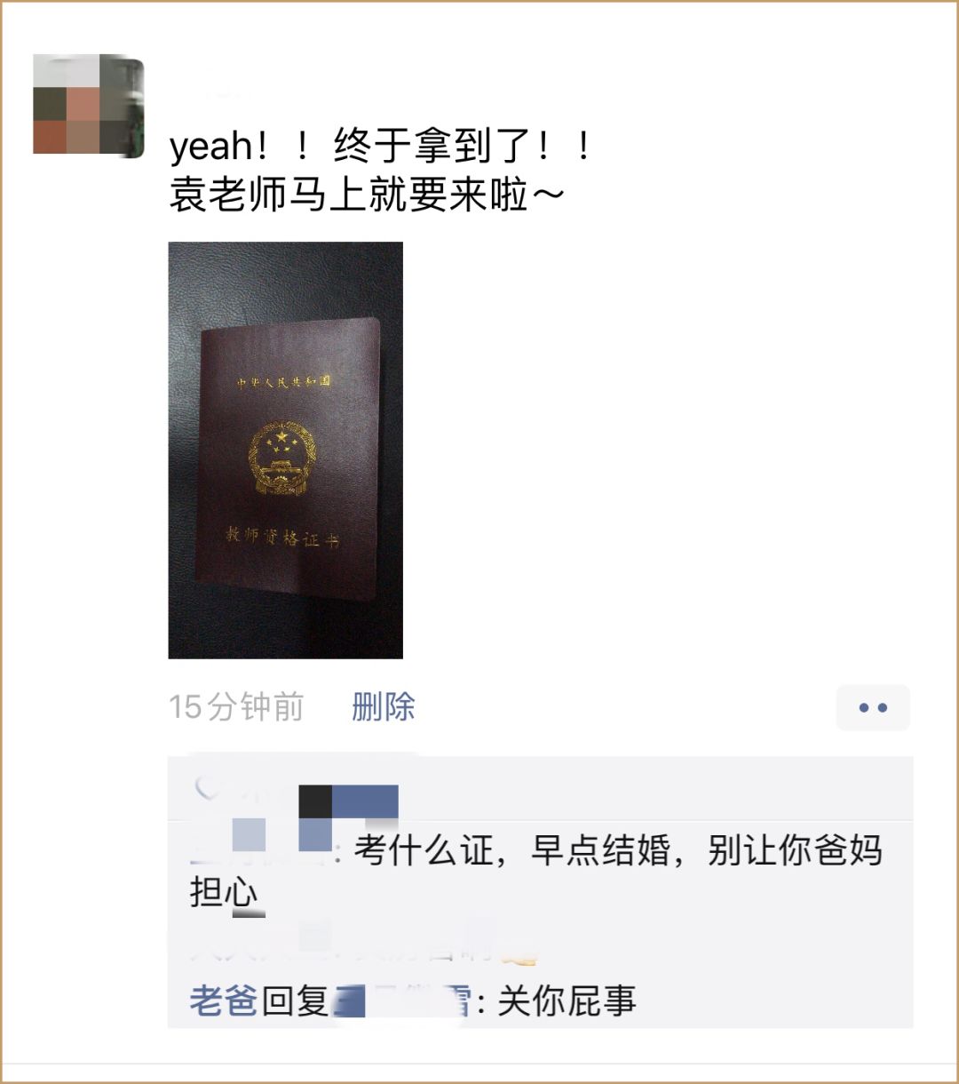 我在朋友圈发了教师资格证,有个亲戚留言让我早点找对象,别让我爸担心。和男友在一起三个月后,迫不及待的带他见了我爸。我爸问我喜欢他什么?女孩子最重要的是让自己发光,而不是找个金光闪闪的对象。”