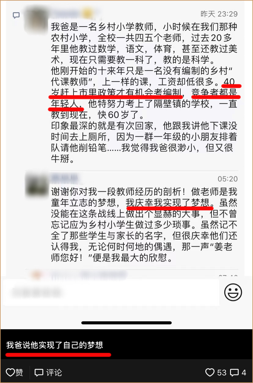 “现在觉得,如果这辈子能活成我爸那样,我也知足了。”家里的经济来源是妈妈,爸爸是乡村教师,事业上没多大起色。但后来她才知道,她爸是 40 岁才等来机会考编,成为正式的人民教师,实现了自己的梦想——我猜,很多人都曾经发过“毒誓”,一定不能活成爸妈那样。![]()