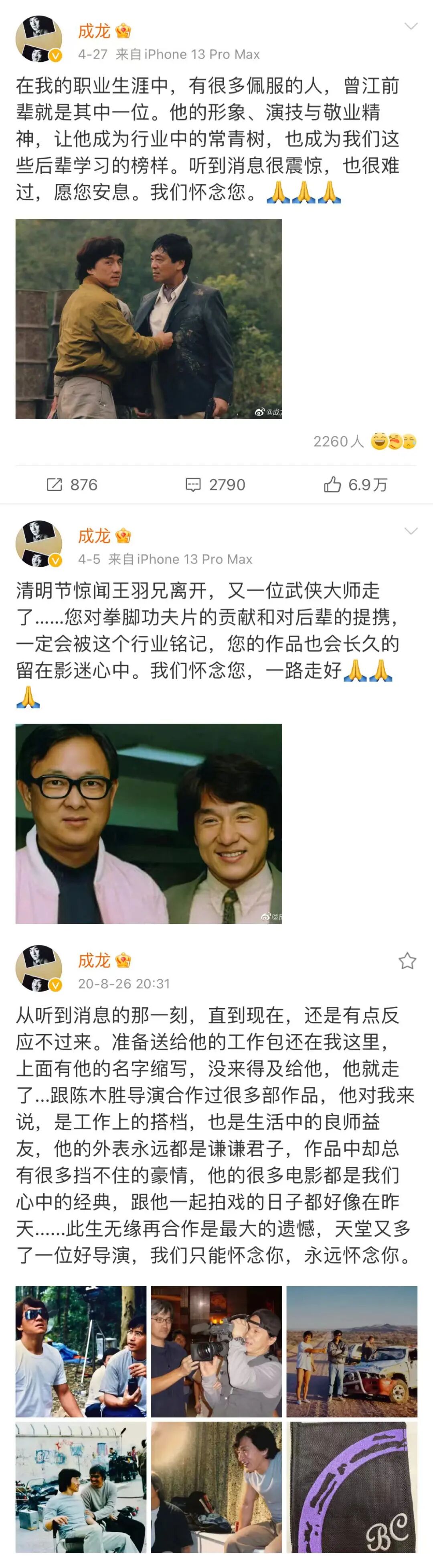 都是香港电影的重要参与者。成龙在微博里写,“一次又一次的告别,会更加提醒我们不要忘记曾经的情谊。”