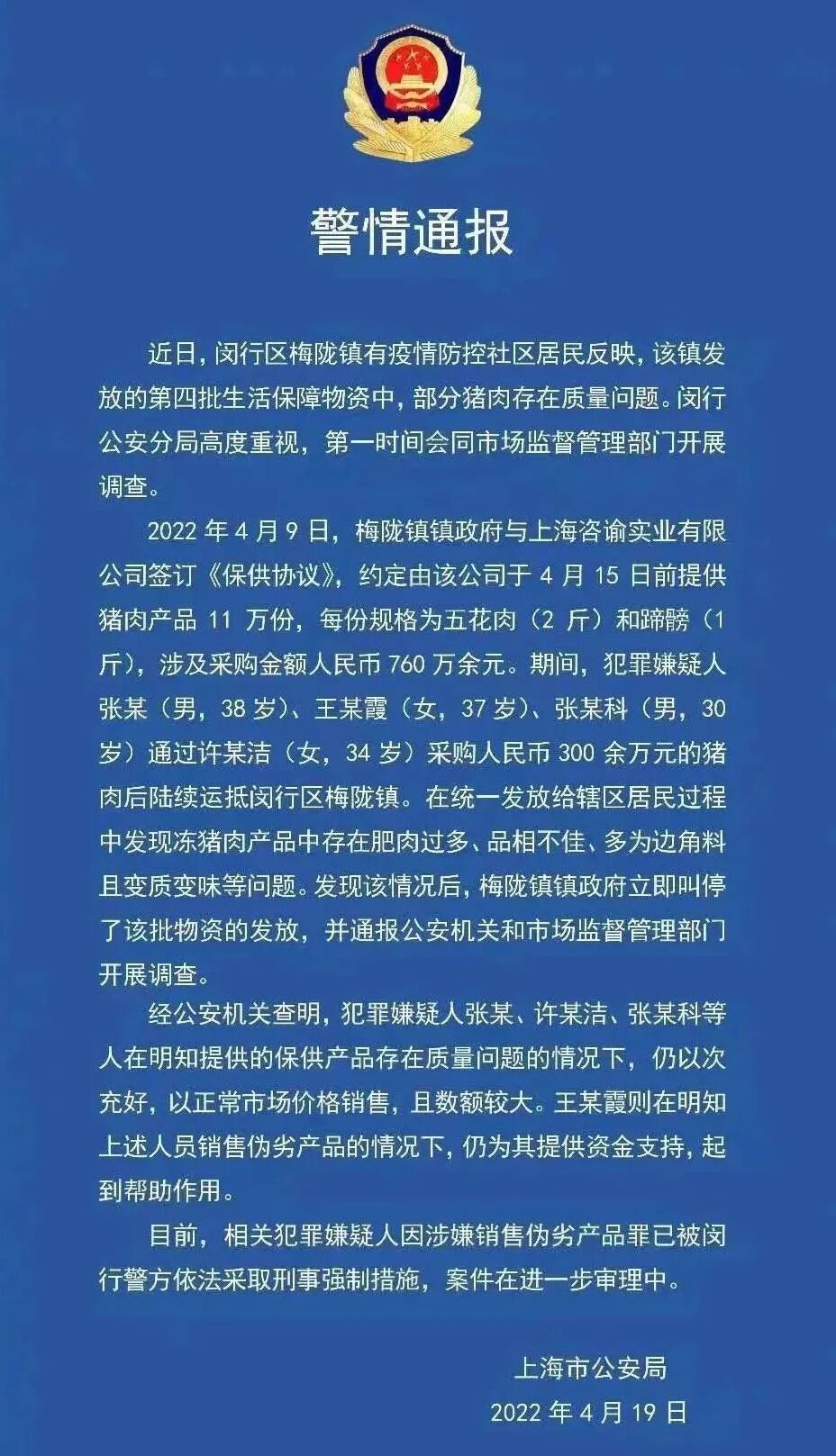 一是上海闵行区梅陇镇保供物资出现劣质猪肉,警方通报称,犯罪团伙用300万元购入猪肉,转手以760余万元高价卖给政府,利润超过150%;二是上海静安区某犯罪嫌疑人将批发食品高价销出,售价175万元,获利150余万元,利润率几乎达到600%;三是有网友反映上海市浦东新区周浦镇发放的防疫物资存在质量问题,目前有关部门已介入调查;此外,上海相关负责任人表示,近期受理的投诉举报中,发现了部分保供物资尤其是生鲜食品出现质量问题。