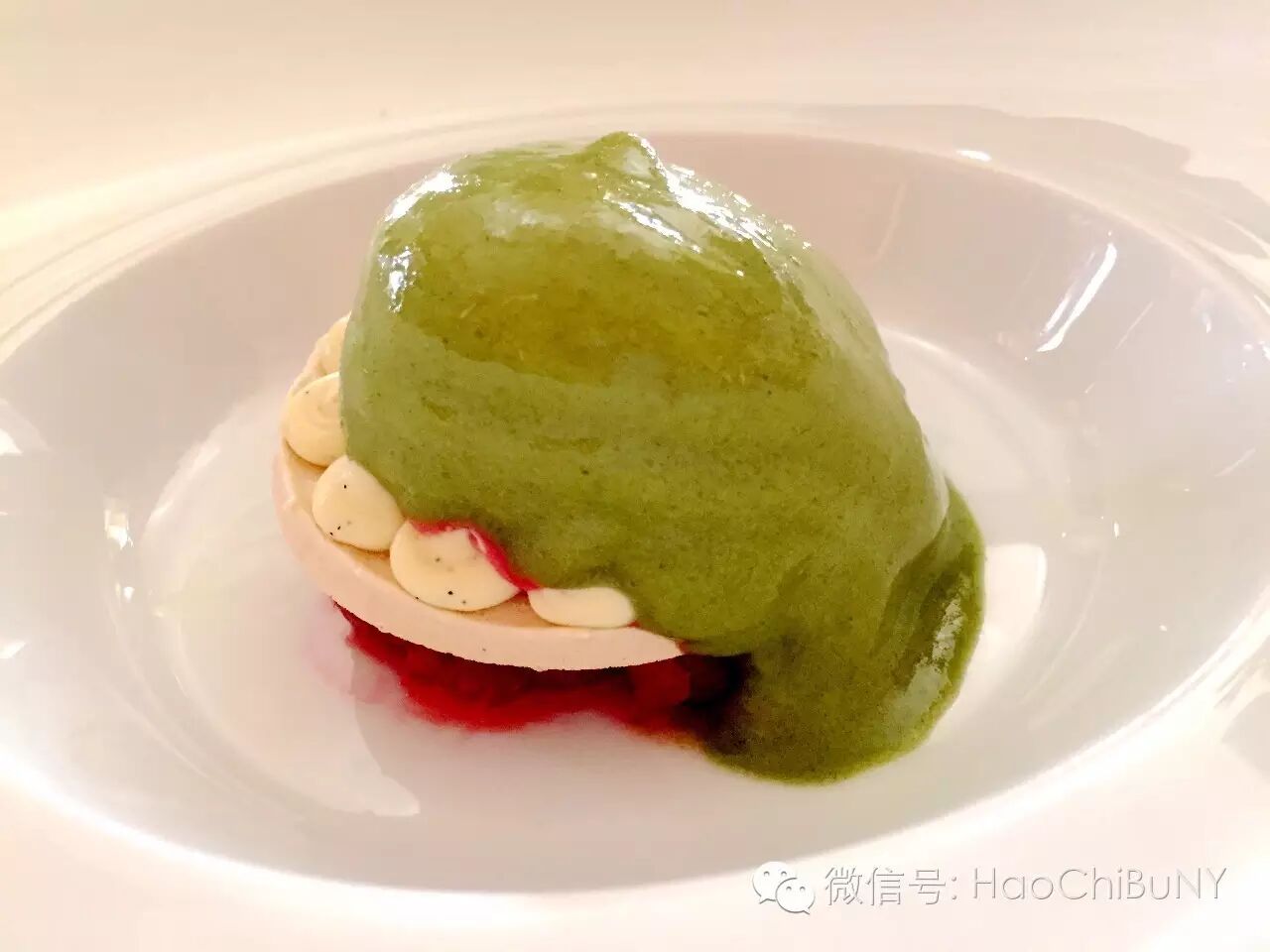 这个小怪物的本体其实是被罗勒酱覆盖的树莓sorbet,像牙齿一样的是柠檬香草奶油和又脆又甜的蛋白奶霜(meringue),最下面则是新鲜树莓。