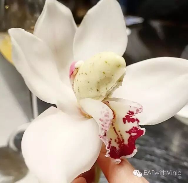 经历了一场心碎的回忆之后,是时候take a break了。主厨端上来一盘新鲜的兰花, 每朵兰花中间是紫苏(shiso) 青柠口味的冰球,这不仅仅作为上面爱情故事的收尾,酸甜中夹杂的草叶味也是给味觉的洗礼。