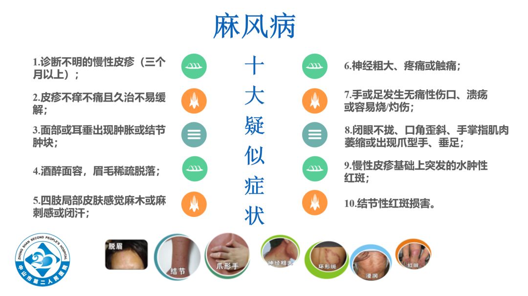 早期症状可有:皮肤出现浅色斑、淡红斑甚至浸润、有麻木或者感觉减退,皮疹表面干燥或与皮疹周围相比无汗,有蚁行感或微痒感。但凡慢性不痛不痒的皮疹,应怀疑有麻风的可能。