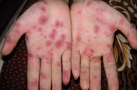有全身症状,一般在硬下疳消退后相隔一段无症状期再发生。梅毒进入二期时,梅毒血清学试验几乎100% 阳性。80%~95%的病人发生皮肤梅毒疹。特点为疹型多样和反复发生、广泛而对称、不痛不痒、愈后多不留瘢痕、驱梅治疗迅速消退。主要疹型有斑疹样、丘疹样、脓疱性梅毒疹及扁平湿疣、掌跖梅毒疹等。