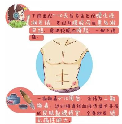 好发部位为生殖器、肛周等,也可见于唇、舌、乳房等处。一般于感染后9~90天出现,大多数病人硬下疳为单发、无痛无痒、圆形或椭圆形、边界清晰的溃疡,高出皮面,疮面较清洁,触之有软骨样硬度。持续时间为4~6周,可自愈。