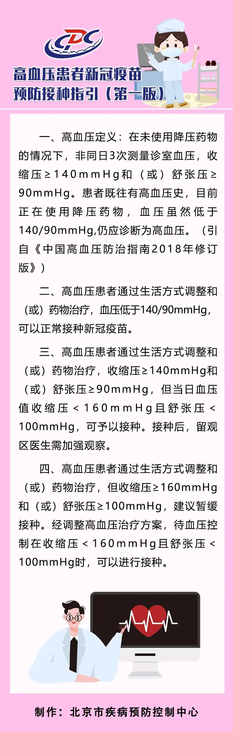 三、高血压患者通过生活方式调整和(或)药物治疗,收缩压≥140mmHg和(或)舒张压≥90mmHg,但当日血压值收缩压<160mmHg且舒张压<100mmHg,可予以接种。接种后,留观区医生需加强观察。