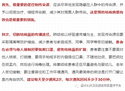 预防和控制任何一个传染病,重在做好三个方面措施:一是控制传染源,防止传播给其他人;二是切断传播途径,也就是使引起传染病的病原体没有渠道向周围传播;三是保护好易感人群,使健康人避免被感染。就结核病而言, 要采取以下措施: