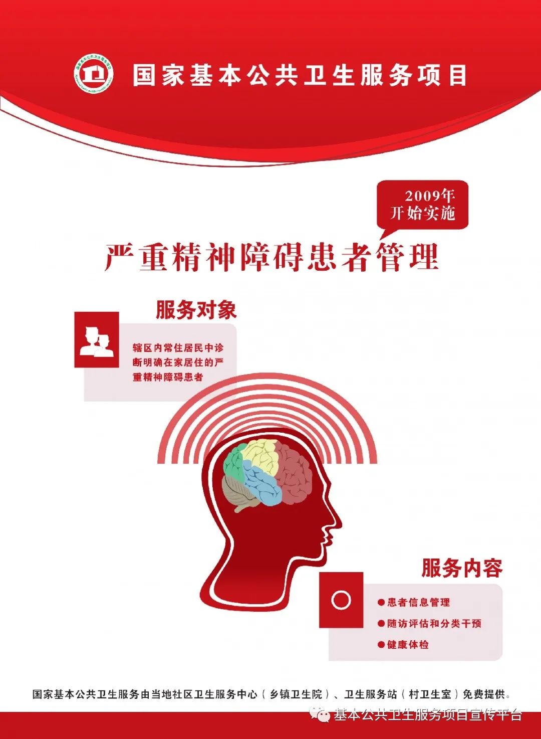 对象:辖区内常住居民中诊断明确、在家居住的严重精神障碍患者(精神分裂症、分裂情感性障碍、偏执性精神病、双向情感障碍、癫痫所致精神障碍、精神发育迟滞伴发精神障碍等)。免费服务内容:患者信息管理、随访评估并进行危险评估,根据患者危险性分级、精神症状是否消失、自制力是否完全恢复,以及患者是否存在药物不良反应或躯体疾病情况进行分类干预,每年进行1次健康体检(包括一般体格检查、血常规、转氨酶、血糖、心电图等)。目的:对患者和家属进行健康教育训练,控制病情发展。![]()