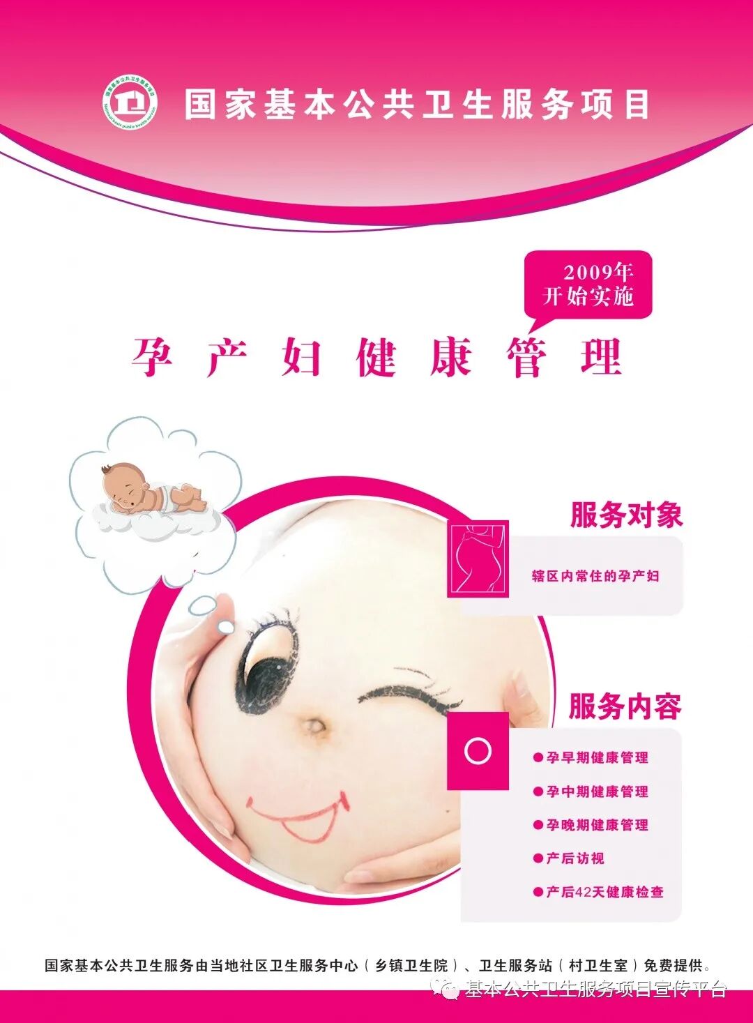 免费服务内容:孕13周前为孕妇建立《母子健康手册》,并进行第1次产前检查,开展健康状况评估;孕16-20周、21-24周免费随访(免费随访项目包括:测体重、血压、宫高、腹围、听胎心、化验血常规和尿常规、询问一般情况,给予健康指导),并录入产检信息;28-36周、37-40周免费随访(给予促进自然分娩、母乳喂养及孕期并发症、合并症预防指导),并录入信息;孕前三个月和孕后三个月免费发放叶酸;产后3-7天内到产妇家中进行产后访视,进行母乳喂养和新生儿护理指导;产后42天健康检查,正常产妇到辖区基层医疗卫生机构健康检查,异常产妇到原分娩医疗保健机构检查。