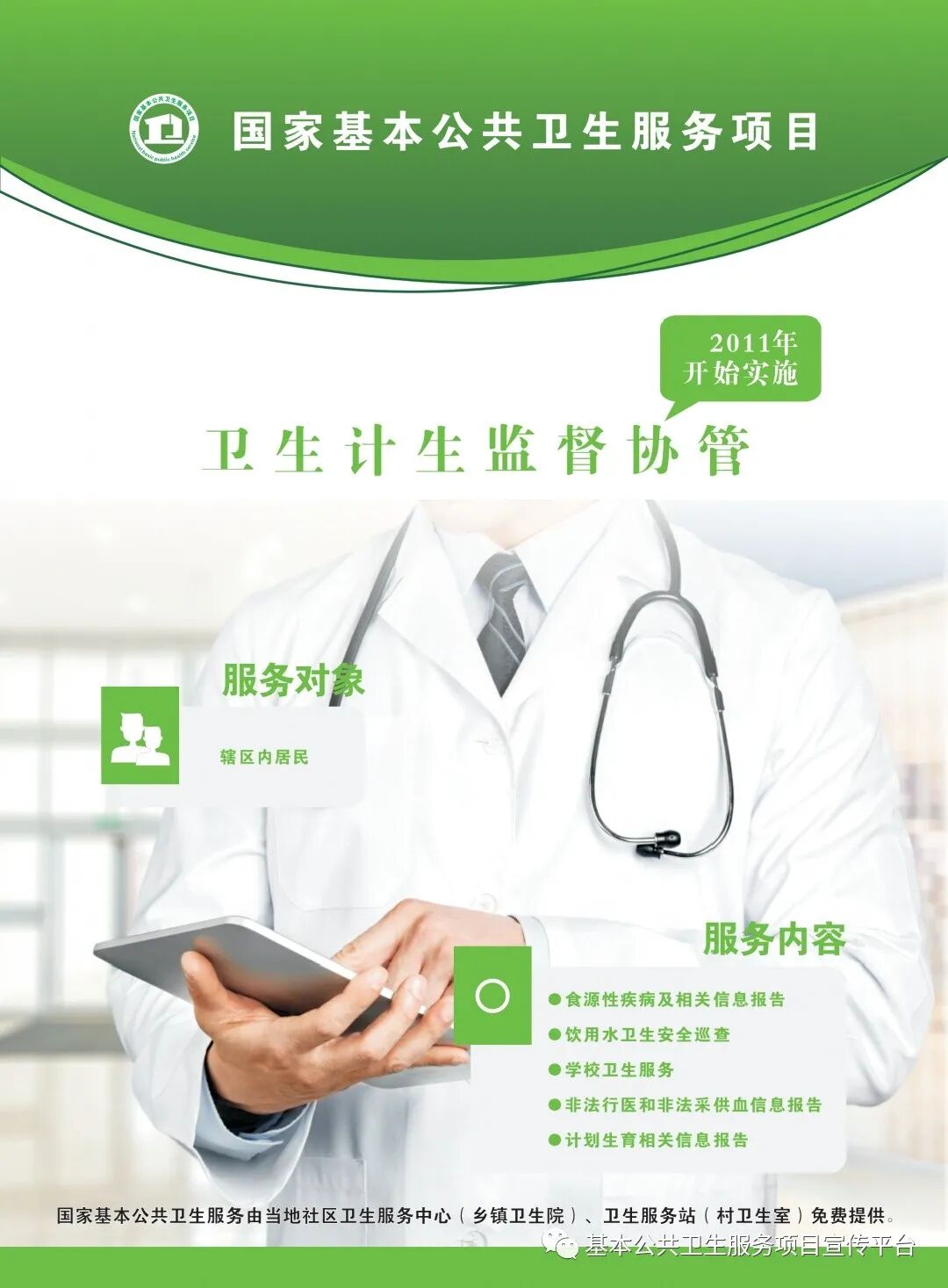 免费服务内容:食源性疾病及相关信息报告、饮用水卫生安全巡查、学校卫生服务、非法行医和非法采供血信息报告、计划生育相关信息报告。