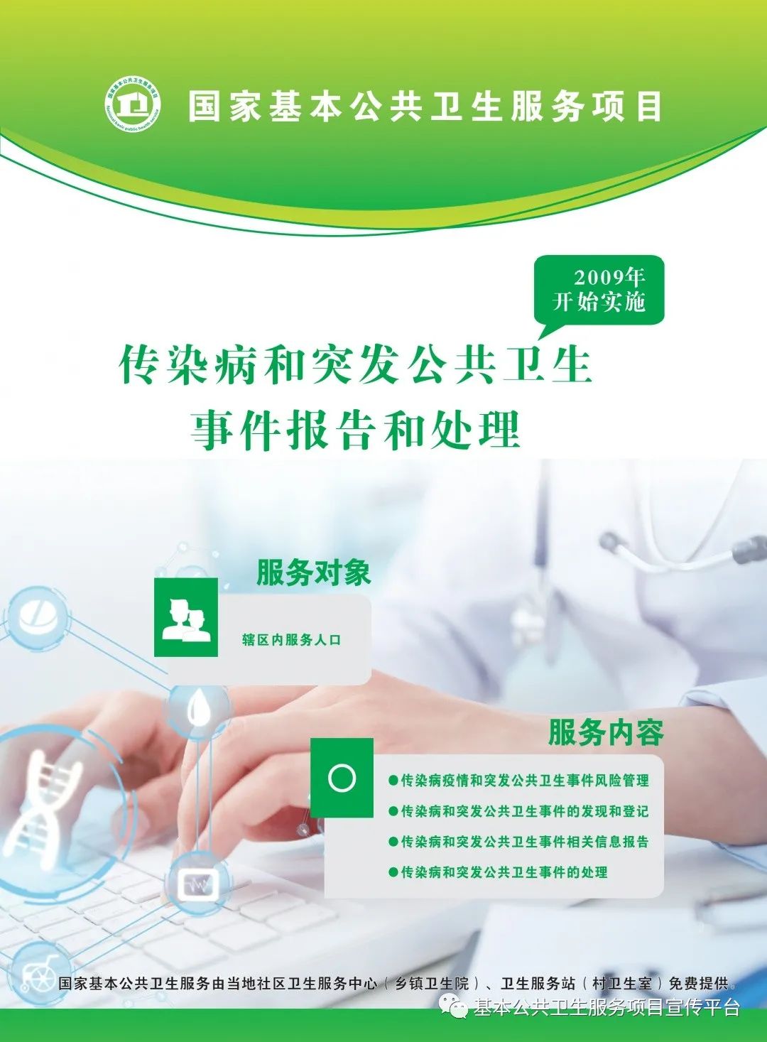 免费服务内容:传染病疫情和突发公共卫生事件风险管理;传染病和突发公共卫生事件的发现和登记;传染病和突发公共卫生事件相关信息报告;传染病和突发公共卫生事件的处理,包括病人医疗救治和管理、传染病密切接触者和健康危害暴露人员的管理、流行病学调查、疫点疫区处理、应急接种和预防性服药、宣传教育等;协助专业防治机构做好结核病和艾滋病等传染病患者的调查、随访、评估、干预、宣传、督导等预防控制措施以及非住院病人的治疗管理工作。目的:将事件危害缩小到最低、对居民健康伤害到最小。![]()