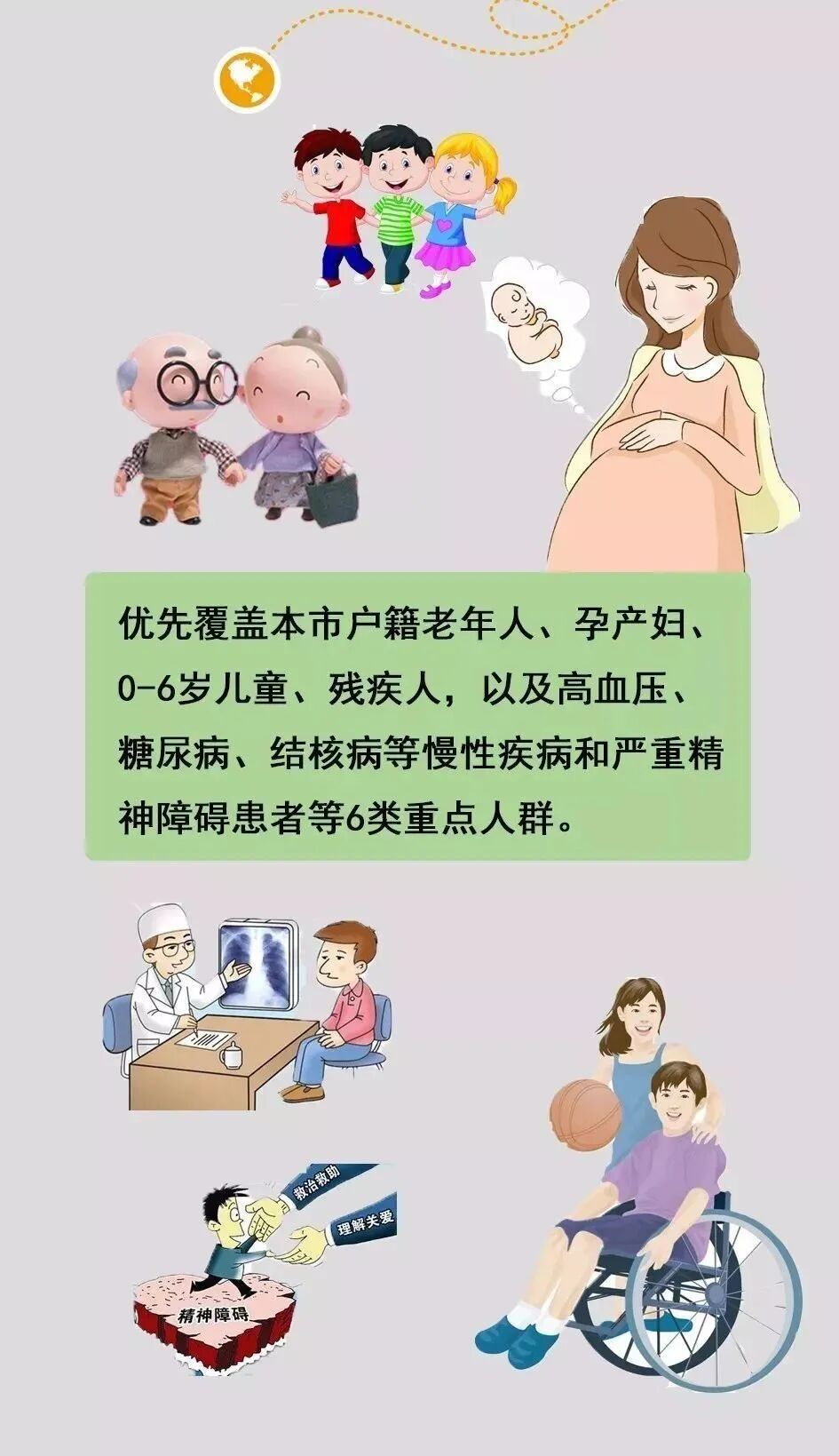 重点疾病健康管理。家庭医生每年为原发性高血压患者和糖尿病患者提供1次健康检查,包括常规体格检查和健康状况评估。每年为糖尿病患者提供4次空腹血糖检测。每年为原发性高血压患者、糖尿病患者和诊断明确并在家居住的严重精神障碍患者提供4次随访。为确诊并在家居住的肺结核患者每月随访1次。