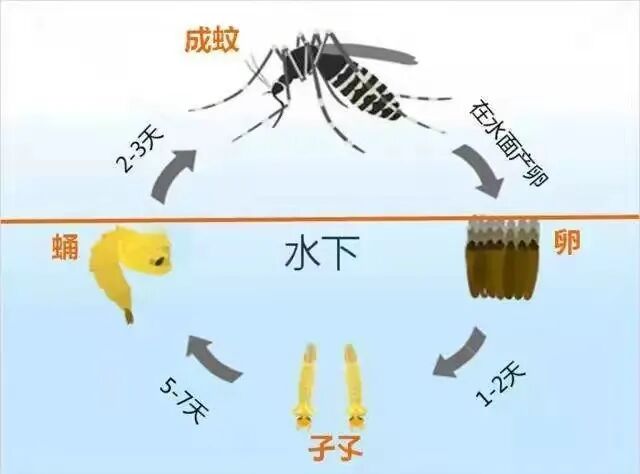 蚊的一生分为卵、幼虫、蛹、成蚊四个阶段,除成蚊阶段外均生活在水中,因此水对蚊虫的发育极为重要,主要是各种积水如盆栽里的积水、下水道积水、雨后各种容器积水等。