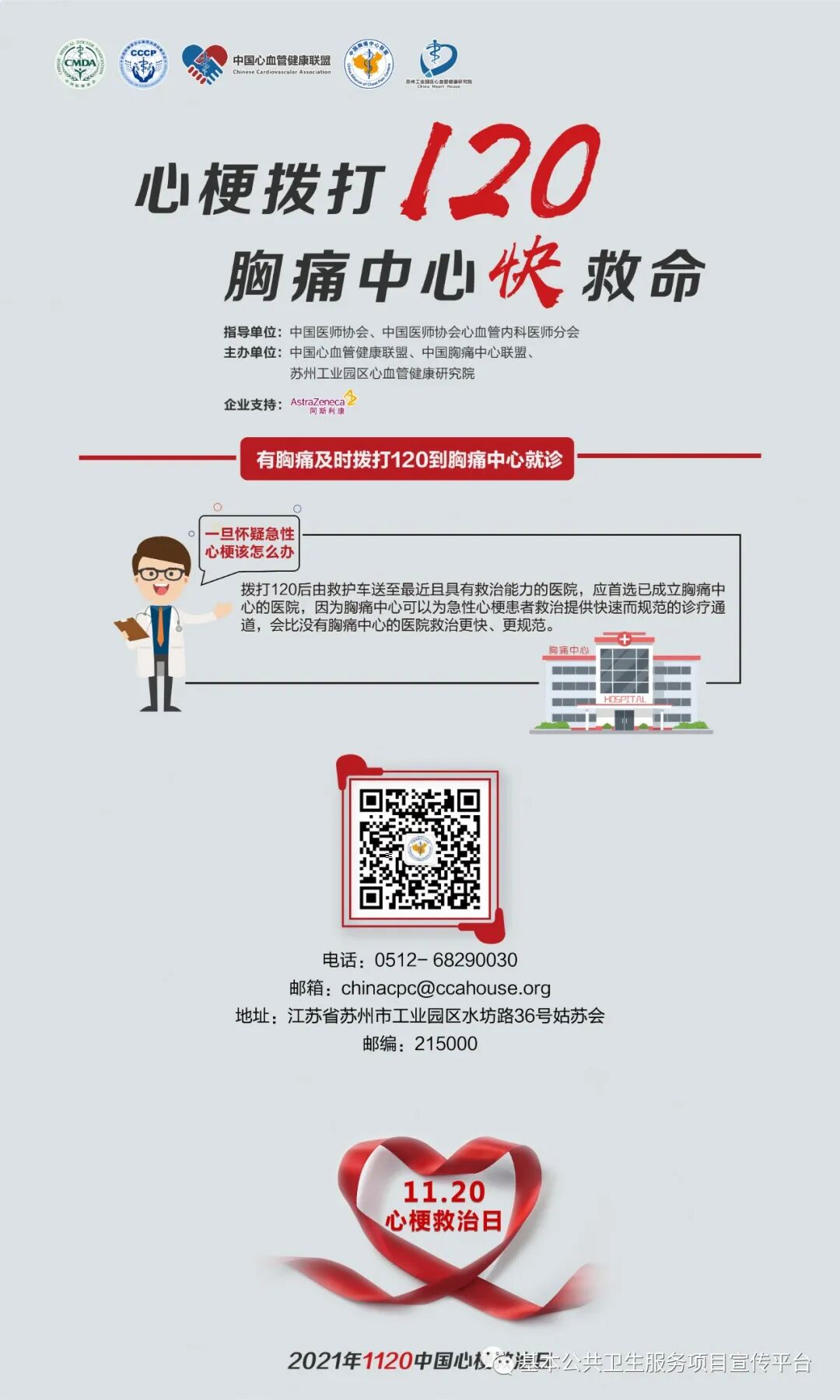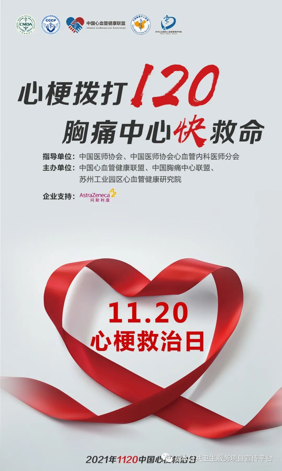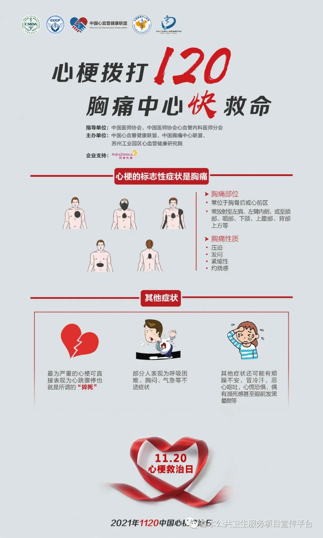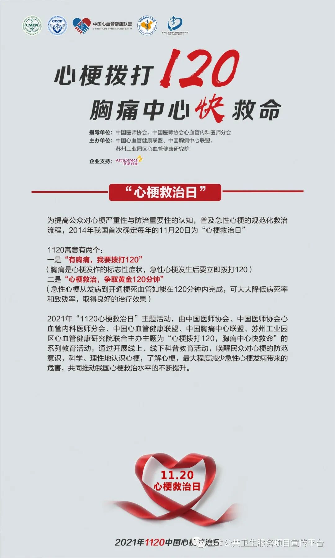 今年心梗救治日由中国医师协会、中国医师协会心血管内科医师分会指导,中国心血管健康联盟、中国胸痛中心联盟、苏州工业园区心血管健康研究院主办,主题是“心梗拨打120,胸痛中心快救命”。