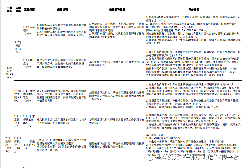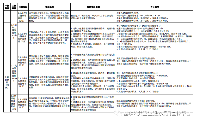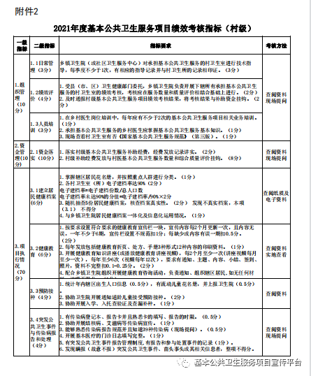 (二)年终绩效考核。对2021年度全年的基本公共卫生服务项目工作情况进行全面考核,检查各乡镇(街道)当年度14项基本公共卫生服务项目的完成情况。具体考核内容和评分标准见附件1、2。