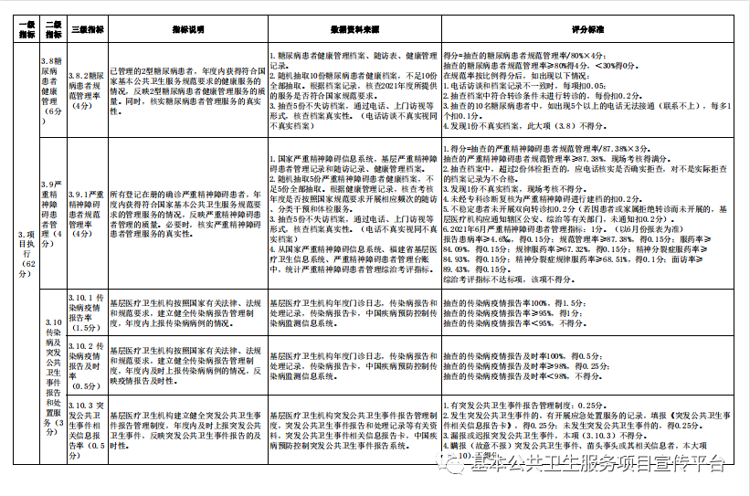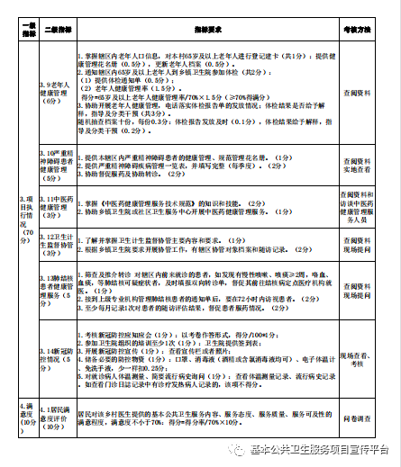 3.项目执行情况。包括居民健康档案管理、健康教育、预防接种、0-6岁儿童及孕产妇健康管理、老年人健康管理、慢病健康管理(高血压、糖尿病)、严重精神障碍患者管理、传染病及突发公共卫生事件报告和处理、卫生计生监督协管、中医药健康管理、结核病患者管理、避孕药具发放和健康素养促进共14项基本公共卫生服务项目开展的服务数量和服务质量全面考核,并增加家庭医生签约服务、基本药物制度执行情况。