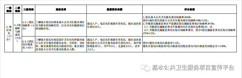 4.项目效果。考核卫生院(社区卫生服务中心)的健康档案动态使用、重点人群健康管理效果、居民知晓率、服务对象满意度等情况。鼓励各卫生院(社区卫生服务中心)总结项目管理的创新点、工作亮点。