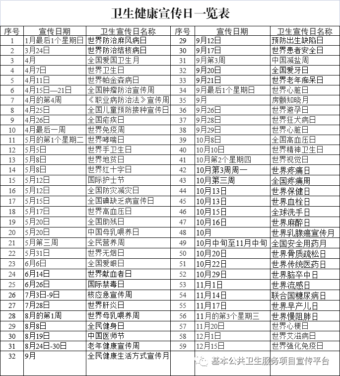 | 31 | 8月24日-30日 | 老年健康宣传周 | 59 | 12月15日 | 世界强化免疫日 |