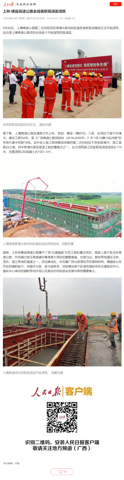 5月20日,中铁上海工程局集团承建的上横高速公路第二合同段项目首联现浇箱梁正式开始浇筑,这也是上横高速公路项目全线首个开始浇筑的现浇梁。