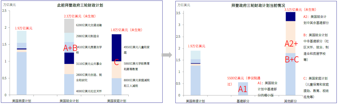 ► 一些中长期支出和税收计划会覆盖多个财年度,如此次5500亿美元新增基建、3.5万亿美元支出和加税计划都是覆盖5~8年的时间,需要单独立法,一旦通过会纳入到每年的预算安排中。
