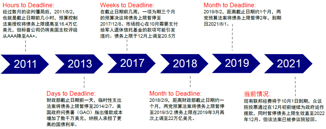 2021年9月底到10月中,美国面临一系列重要的财政政策节点,如此前已经通过参议院的5500亿美元基建投资、包含加税计划的3.5万亿美元支出方案、10月1日新一财年的拨款法案(无法按时通过会导致政府关门)、10月18日可能触及的债务上限(无法及时解决会导致政府违约),这也是我们在9月月报提示短期转向防风险的主要原因(《海外资产配置月报(2021-9):短期转向防风险》)。