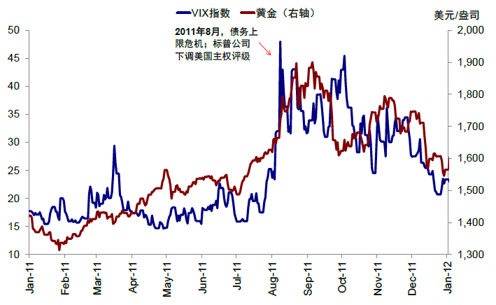 图表17:2011年期间,黄金和VIX指数均大幅攀升,避险情绪浓厚