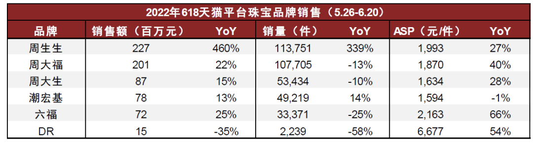 6月为行业拐点,金银珠宝类社零同比转正。上海和北京部分区域于6月恢复正常生产生活秩序,叠加618线上大促等活动,珠宝首饰销售出现明显回暖,6月金银珠宝类社零同比上升8.1%。据魔镜市场情报,618大促期间天猫平台珠宝/钻石/翡翠/黄金品类销售额同比增长142%。