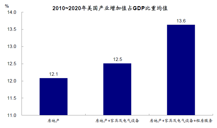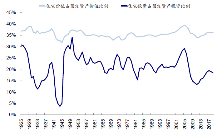 对于整体经济而言,住宅是固定资产的重要组成部分。房地产板块在美国经济中的占比相对稳定,以当前成本计算,2019年美国住宅价值净存量为23.6万亿美元,占比全部固定资产存量高达36%。从增加值角度,房地产增加值占GDP比重为11%~13%,若合并与房地产相关的家装以及相关的租房等服务项支出,那么其占GDP的比例为13~15%,因此仍是经济增长的重要贡献力量。从房地产投资看,2019年住宅投资占美国固定资产投资18%,占GDP比例在5%左右,相对中国较低(2020年10.2%)。