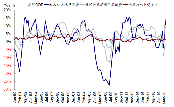 结构上,成屋市场占绝对主导,因此消费属性大于投资属性。成屋市场在美国整体房地产市场交易中占比高达八九成,这与中国存在较大差异。因此从地产销售和相关产品的关联上,美国房地产对下游消费的拉动要大于上游;同时由于进口比例更高,因此地产需求也有显著的外溢效应。