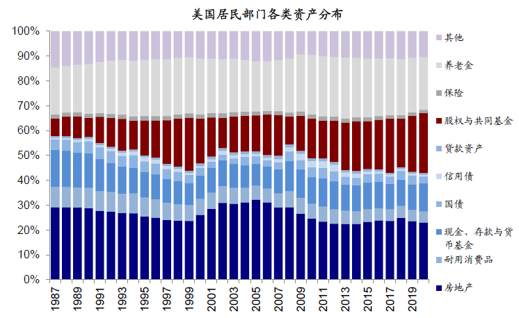 图表:美国居民部门资产分布:股市与房地产和养老金的规模基本相当,当前占比均在20~25%左右,是整体美国居民资产构成中最重要的三个类别