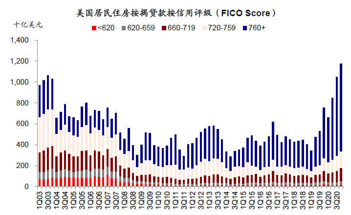 在负债端,在美国抵押贷款是主要的购房融资形式、虽然在金融危机后抵押贷款购房数量瀑布式下滑,但当前占比仍达到了69.0%。居民购房对加杠杆的依赖使得房地产市场空间依赖于居民资产负债表水平。此外杠杆率衍生出的信用质量也是房地产市场扩张的制约因素。信用质量较差的人口进入房地产市场产生大量次级贷款,是2008年次贷危机主要原因之一。虽然仍旧可能存在和2008年类似的信用评价向上偏差,但本轮加杠杆人群主要是高信用质量人群。2020四季度1.05万亿美元贷款中,信用评分高于760的贷款规模达0.84万亿美元,占比高达71.3%,大幅高于金融危机时期的水平(2007年一季度末信用评分高于760的贷款规模占比仅为24%)。我们认为当前居民资产负债情况较为健康。