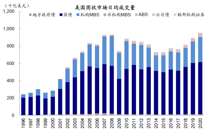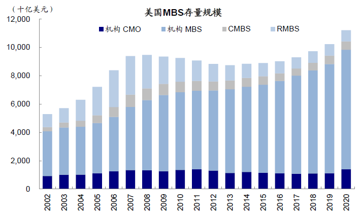 MBS存量规模11.2万亿美元,仅次于国债,占比22.5%。房地产抵押贷款又可通过资产证券化的形势成为金融资产,成熟的金融市场运作使得MBS市场成为除国债之外最大的固定收益市场,机构支持MBS流动性仅次于国债。MBS资产主要分为机构支持和非机构支持,非机构支持资产又根据其抵押资产性质为商业地产或住宅分为CMBS和RMBS[1]。其中机构支持MBS规模最大,流动性也最好。截止2020年底,MBS资产存量为11.2万亿美元,占比美国固收市场22.5%,其中机构支持MBS资产规模为9.8万亿美元,占比MBS规模87.7%。2020年MBS资产(机构+非机构)日均成交量为2930亿美元,占美国固收市场日均成交总量的30.7%,流动性仅次于国债。