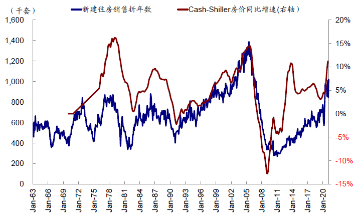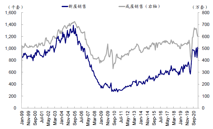 成屋占据房地产交易绝对主导:城市化进程通常伴随着大量的新地产开发。当前美国城市化进程已经过了高速发展期,城市化率达到82%的水平,因此2000年至今成屋交易数量占比房地产销售总量83%~95%。这点和中国市场中房地产主要购买新屋的模式有较大不同。新屋销售数据相对成屋有一定领先意义。对于新屋而言,由于建造周期较长,对新屋抱有投资需求的买家必须权衡所购新屋二次进入成屋市场出售时的投资收益。因此一方面,若成屋价格保持良好增长势头,则新屋由于未来投资收益预期良好,其价格也会水涨船高;另一方面,若投资者认为当前地产已经过热,考虑到未来收益,新屋市场一般会先于成屋市场冷却。